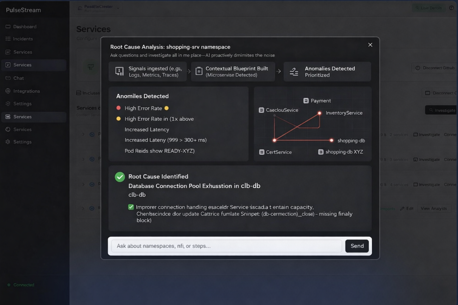 Chat naturally with PulseStream to investigate any incident without context switching between logs, GitHub, dashboards, and documentation.